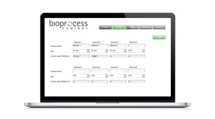 Visualize experimentos em tempo real e monitore a taxa de fluxo e até 5 outros parâmetros, como fluxo de gás, pH, temperatura, composição do gás e sinal definido pelo usuário.